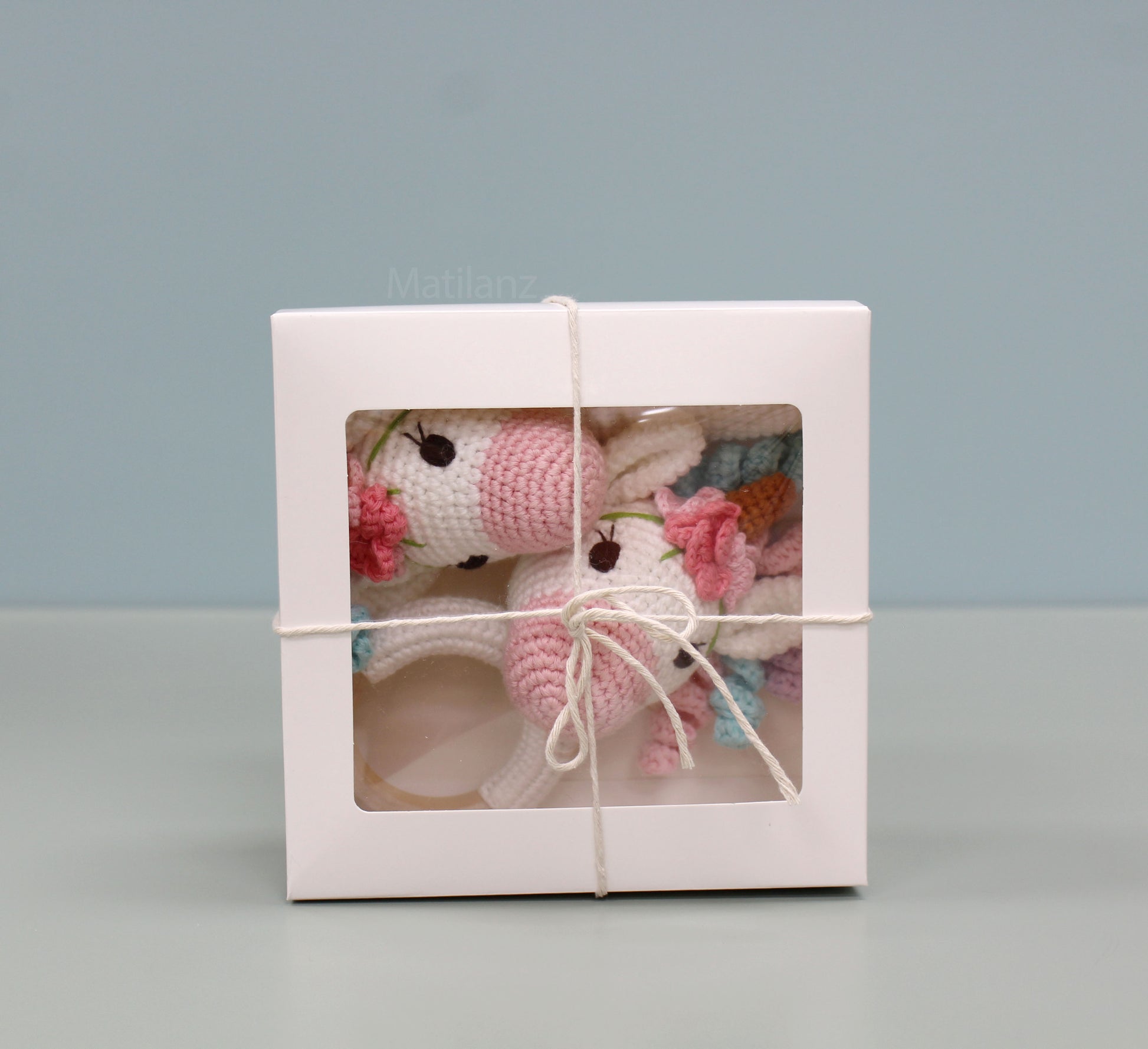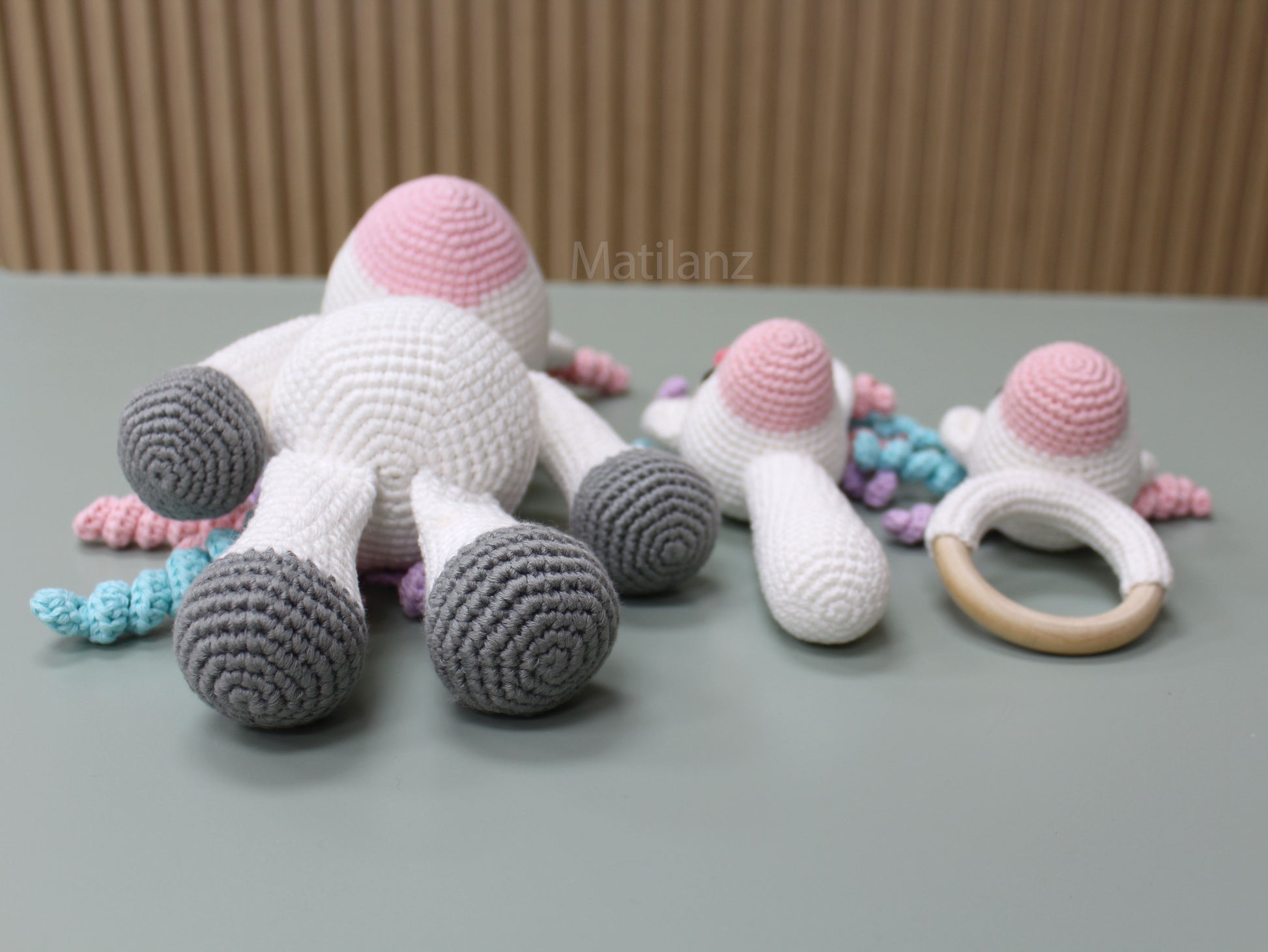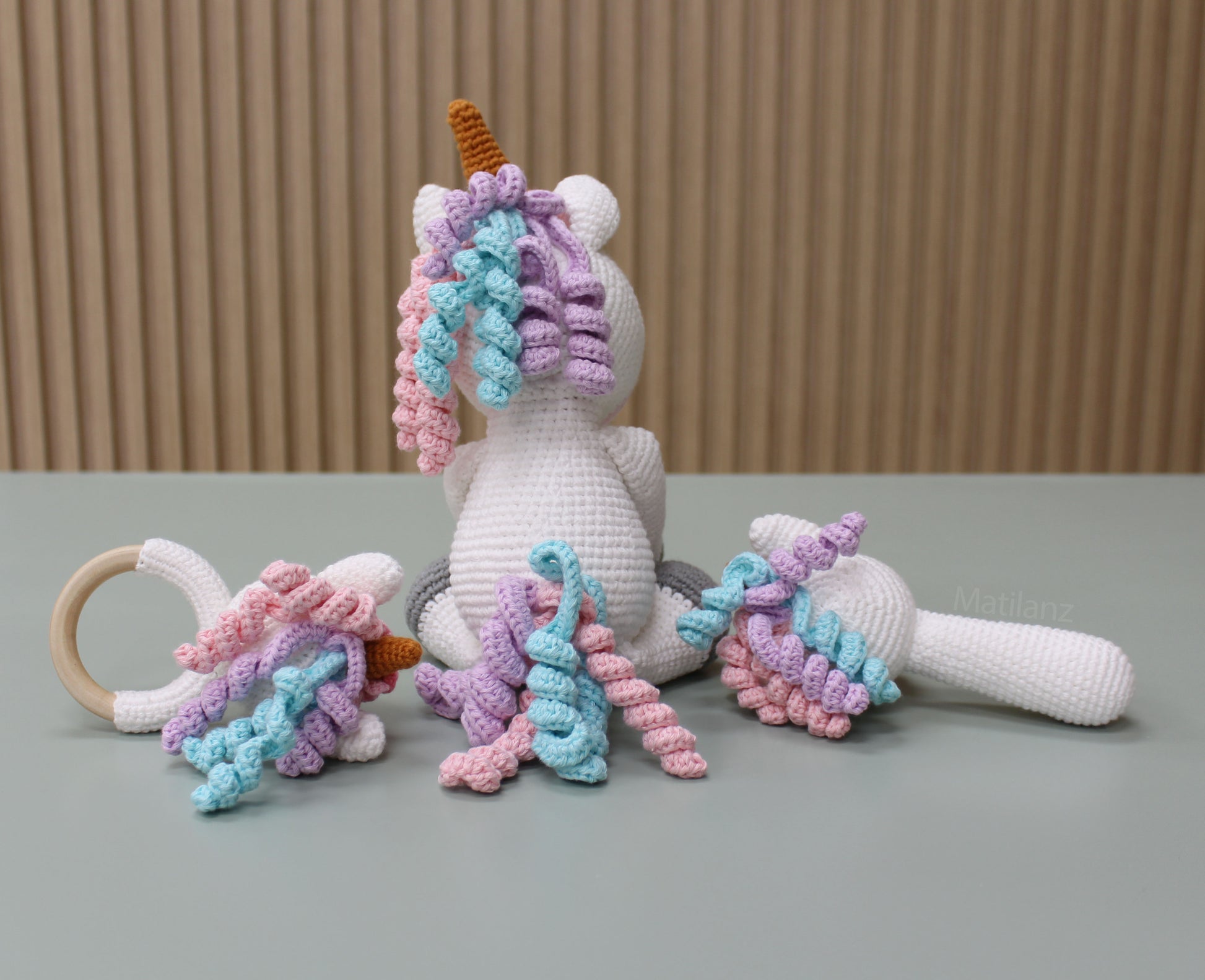 Adorable crochet unicorn baby toy set — handmade with 100% cotton yarn and designed for tiny hands to explore. Soft and durable, this set brings gentle textures and soothing sounds to playtime.